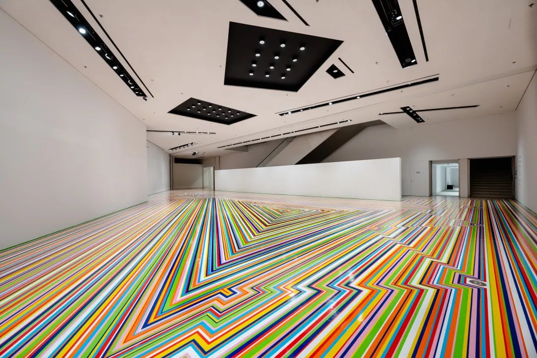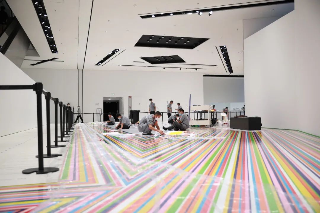 作品完全由乙烯基胶带制成,其中的颜色及排列模式随机产生,由艺术家根据展示空间的不同而进行特定创作,因此它的每次呈现都是独一无二的。本次作品选取八种色彩鲜艳的乙烯基,以三种不同的宽度裁切,近10名布展人员遵照艺术家设置的创作准则,按同心线原则沿空间外侧边缘开启超过20天的现场精心制作——在用单一颜色完成最外圈的空间勾勒后,不断重复这一过程,在边缘内创造新的边界,直至填满整个空间。这种与建筑原有空间布局进行“对话”的创作方式,让观众得以重新审视美术馆蕴含无限潜能的空间设计。