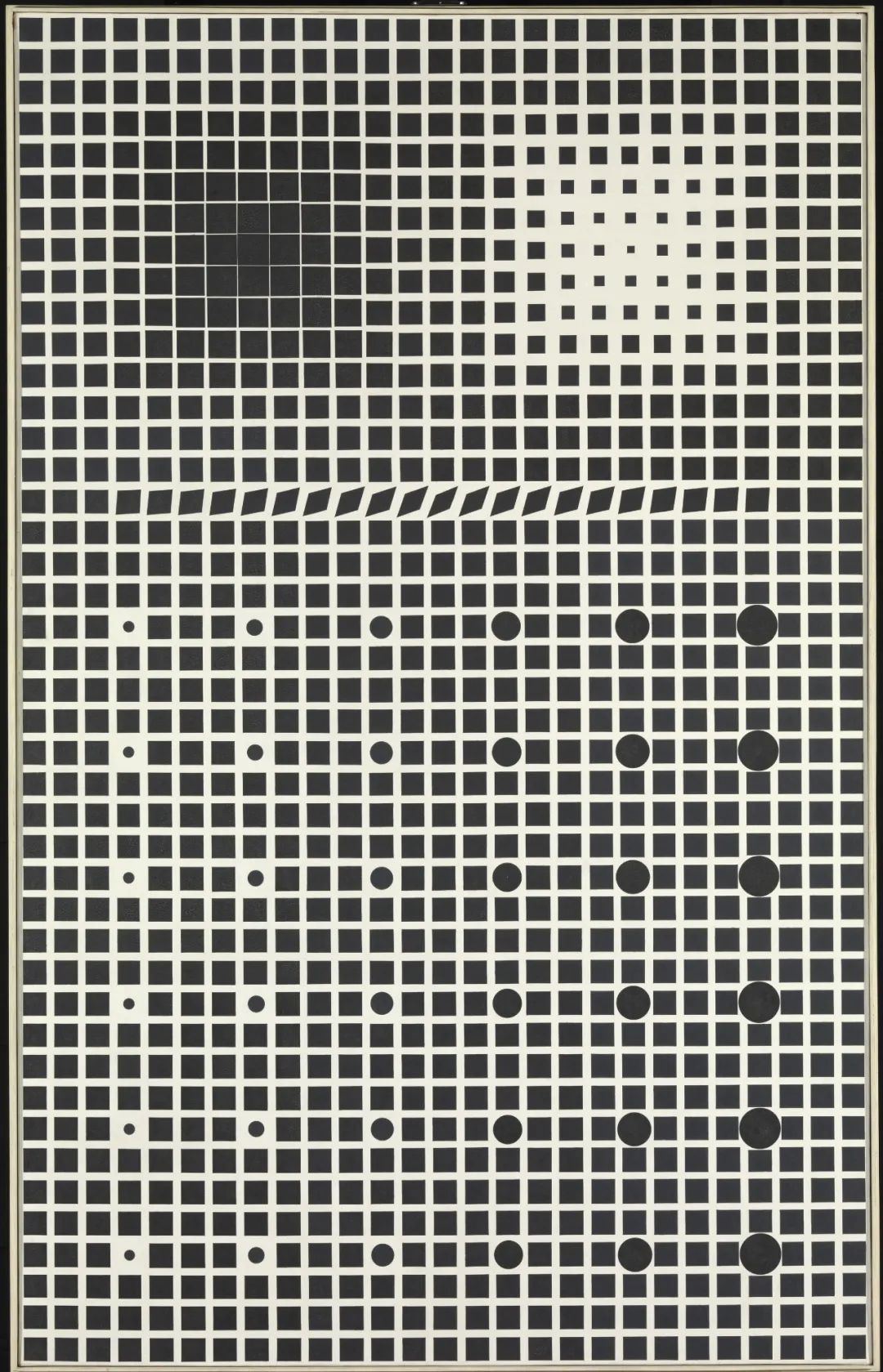 “超新星”是某些恒星在演化接近末期时经历的一种剧烈爆炸,其特征是在星系中迅速产生极其明亮的炫目景观,以及随之而来的缓慢的衰退期。这件作品以“超新星”命名,让人想起这些星系中的神秘聚变所带来的光和能量的激烈变化。瓦沙雷利的作品经过精心设计,他深谙光学技巧,当观众在画面前移动时,根据观看视角的不同,视域内的起伏、方向的翻转和色度的变化,不断刺激人们的视觉体验。布面油画作品《超新星》借鉴了他对电影和摄影的兴趣,以及人眼如何感知图像的正像和负像的本质,作品由1161个黑色小方块组成,内置在一个薄薄的白色垂直网格中。