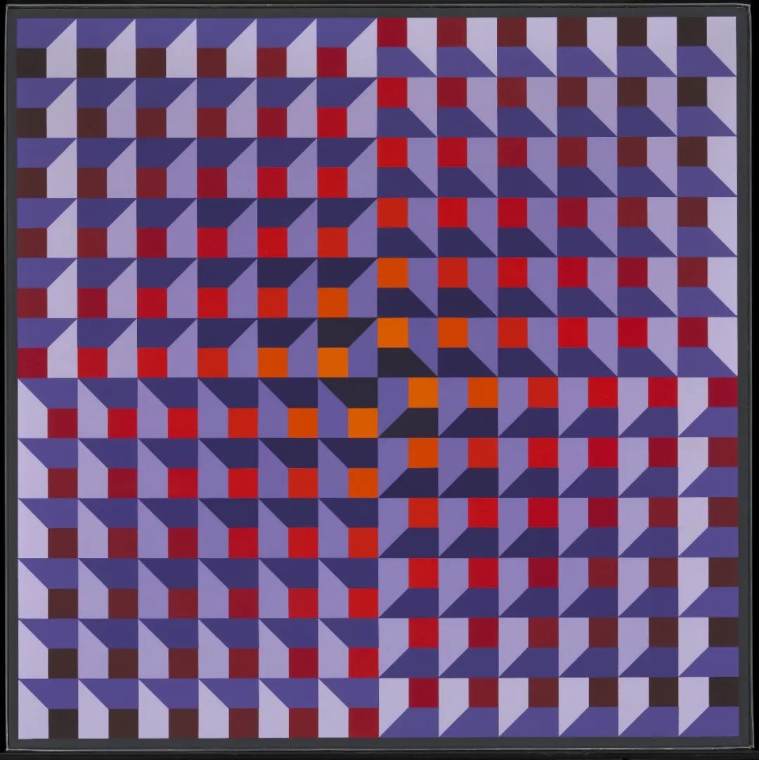 踏进展厅,第一件映入眼帘的作品是维克多·瓦沙雷利(Victor Vasarely)的《超新星》(Supernovae,1959-1961),他被公认为欧普艺术运动的创始人之一。瓦沙雷利对平面图像的二维性质进行实验,并将其用作测试和实验三维空间中感知极限的工具。他试图通过几何抽象来实现这一点,其实践为此次展览中许多艺术家的创作奠定了基础。