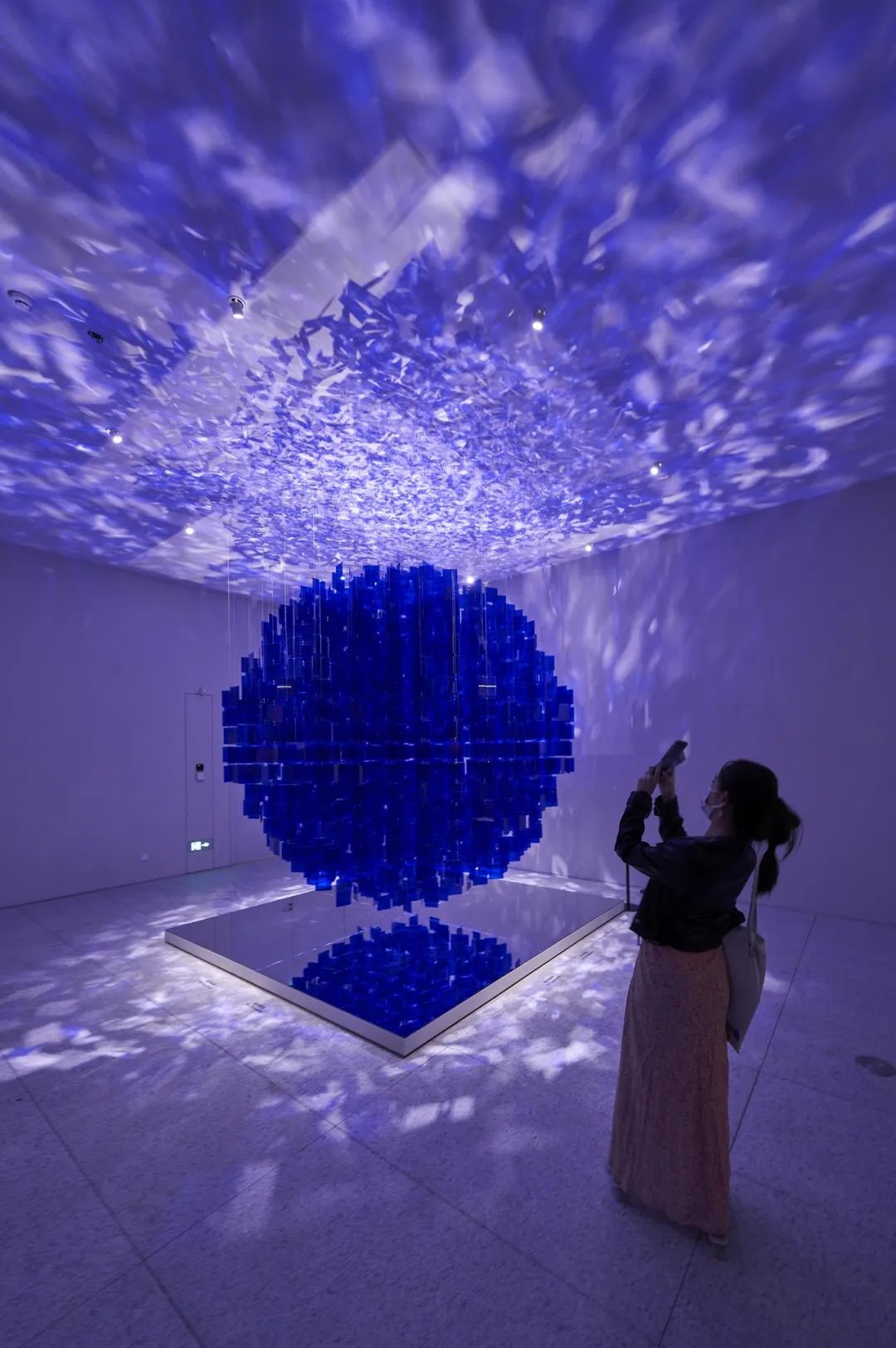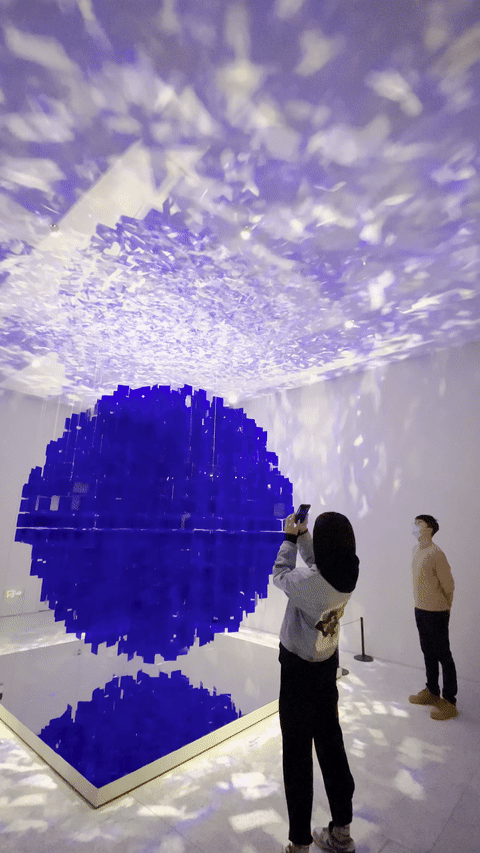 装置作品《蓝色球体》(Sphère Bleue,2001/2022),由勒·帕克为本次展览专门制作,也是展览中颇受观众热捧的打卡点之一。展厅内,有着梦幻般视觉效果的天花板并非影像呈现,而是艺术家利用光和镜面反射完成的巧思,雪花般的光点随机遍布反射于球体表面,破坏了统一形状的幻觉,整个球体不断地聚焦、失焦。展厅内,蓝白色光斑卷集,地上的镜面展台似为作品更添一层维度,光影交织之余,热烈与通透在房间同时绽放。而要实现这一展出效果离不开观众的互动:艺术家邀请观众在作品面前走动起来,由此带动空气中的微风流动,在灯光与镜面反射的共同作用下,作品的细微动态变化变得清晰可见。艺术家的另一件作品《持续移动,持续的光》(Continual Mobile, Continual Light,1963)也鲜明地体现了这一特征。