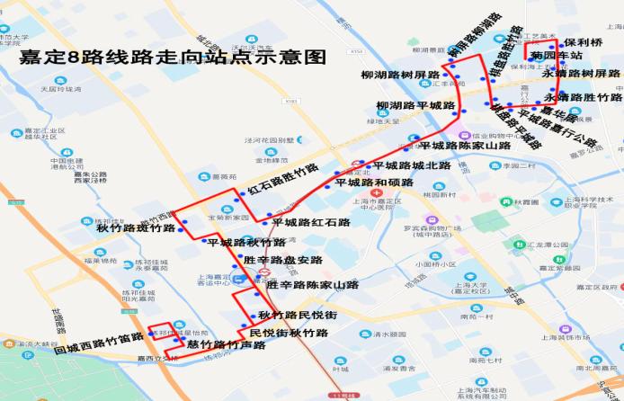 根据2022年嘉定区公交线路新辟、调整实施计划,为填补秋竹路南段的公交空白,自2022年10月31日首班车起,调整嘉定8路走向、站点,具体如下: