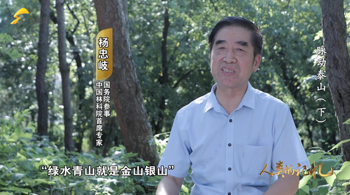 比如在片中,国务院参事、中国林科院首席专家杨忠岐说:泰山林场第五任场长张耀南,1960年就提出了“远山近山风景山、高山矮山花果山”的这样一个构想和奋斗目标,这个提法和这样的目标非常符合“绿水青山就是金山银山”的发展理念。泰山的生态文明建设,经过几代人的共同努力,现在已经取得了非常突出的成就,朝着物种多样性方面稳步发展。