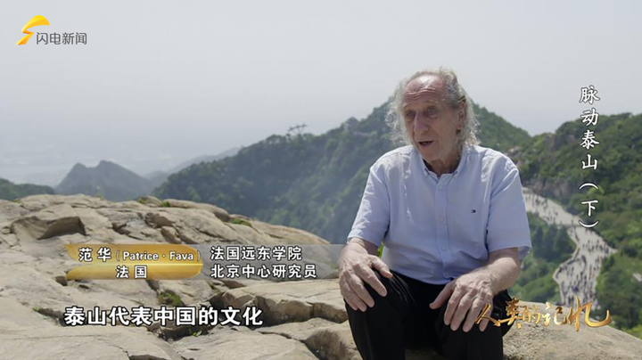 邵波说,在纪录片的下部中,有一段法国远东学院北京中心研究员范华在泰山考察的影像。汉学家范华醉心于中国文化,定居北京30多年。他先后四次考察泰山,尤其痴迷泰山的文化古迹。范华说,泰山代表了中国文化,全部的文化都在泰山,可以一辈子研究泰山文化。“因为有皇帝、孔子、有儒家,也有道教、佛教,三教合一,就是中国传统文化。”范华这样谈他对泰山文化和中国传统文化的认识。邵波说,范华只是热爱泰山文化的一名汉学家的代表,此外纪录片在拍摄中也接触了不少喜欢泰山的来自世界各地的年轻人。某种程度上来说,这是泰山之于世界的文化价值的体现。