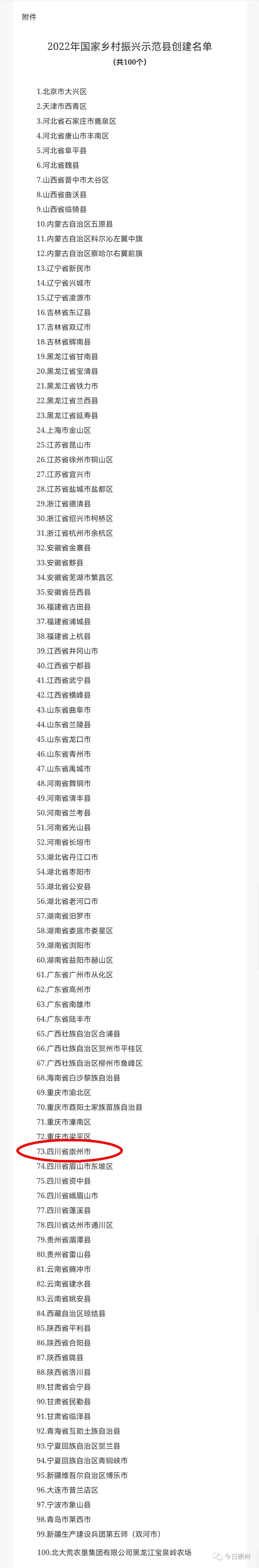 据农业农村部官网消息,为贯彻落实《中共中央、国务院关于做好2022年全面推进乡村振兴重点工作的意见》部署,农业农村部、国家乡村振兴局开展国家乡村振兴示范县创建申报评审工作,经县级申请、市级遴选、省级审核推荐,并经专家评审和社会公示,同意北京市大兴区等100个单位为2022年国家乡村振兴示范县创建单位,现予公布。