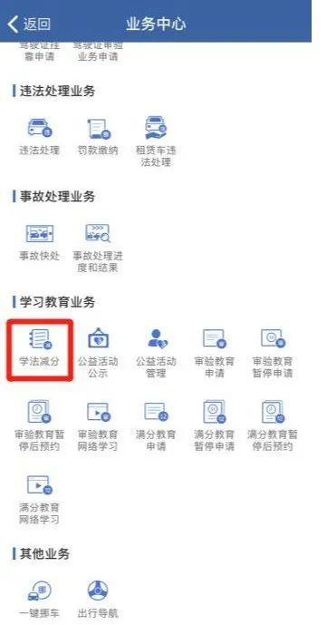 驾驶人用户点击首页业务功能,选择【学习教育业务】模块下->【学法减分】按钮,进入学法减分申请页面。