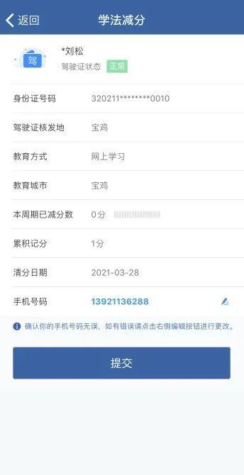 查看提交界面展示信息,对于手机号码有误的,可跳转至修改手机号码界面进行修改,如数据无误,点击【提交】按钮。
