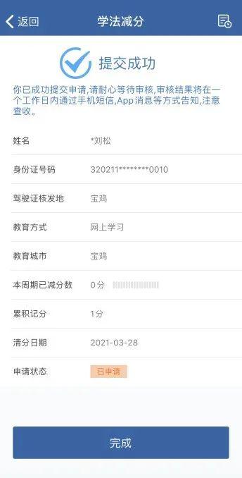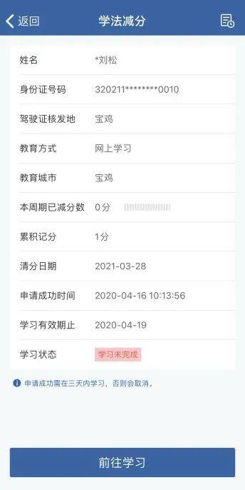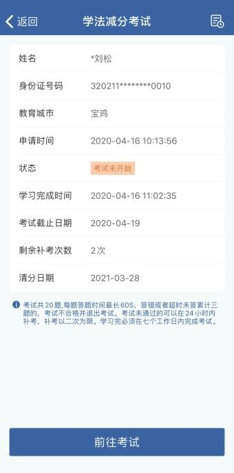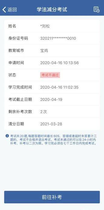 已完成学习的,驾驶人用户点击【学法减分】按钮,在已经完成学习的情况下,点击【前往考试】进入考试,如之前考试没通过且剩余考试次数还有的情况下,点击【前往补考】进入补考。