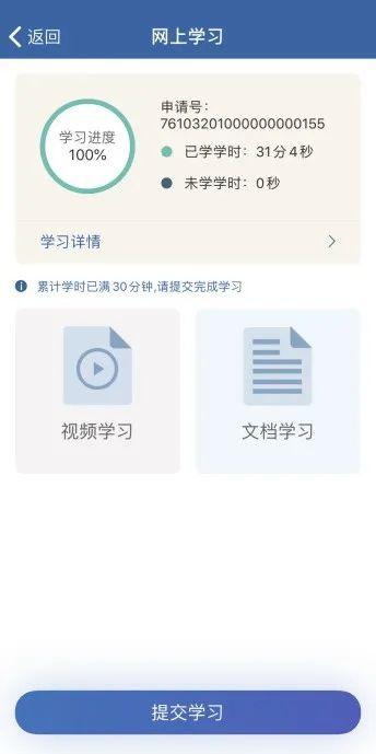 学时学满之后,进入该学习记录提交页面,点击【提交学习】按钮提交。