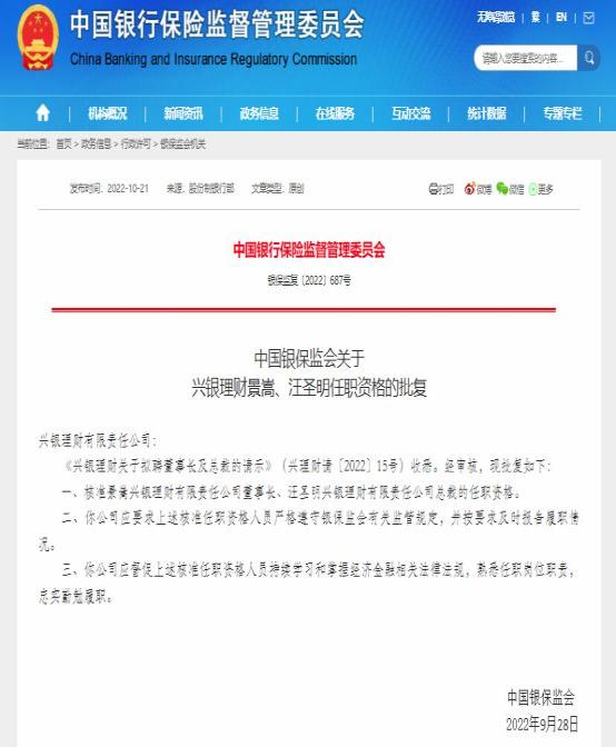 根据批复,银保监会核准景嵩兴银理财有限责任公司董事长、汪圣明兴银理财有限责任公司总裁的任职资格,批复日期为9月28日。