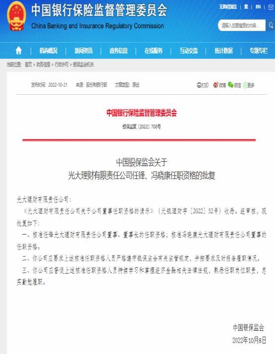 其中,光大理财也将迎来新任董事长。最新批复显示,银保监会核准核准任锋光大理财有限责任公司董事、董事长的任职资格;核准冯晓康光大理财有限责任公司董事的任职资格,批复落款日期为10月8日。