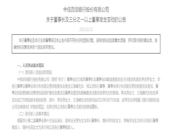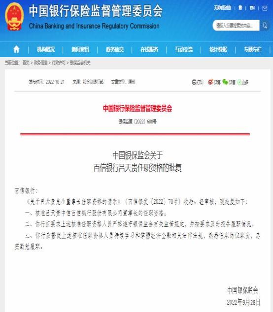 另外,银保监会近期还核准了吕天贵中信百信银行董事长的任职资格,批复日期为9月28日。