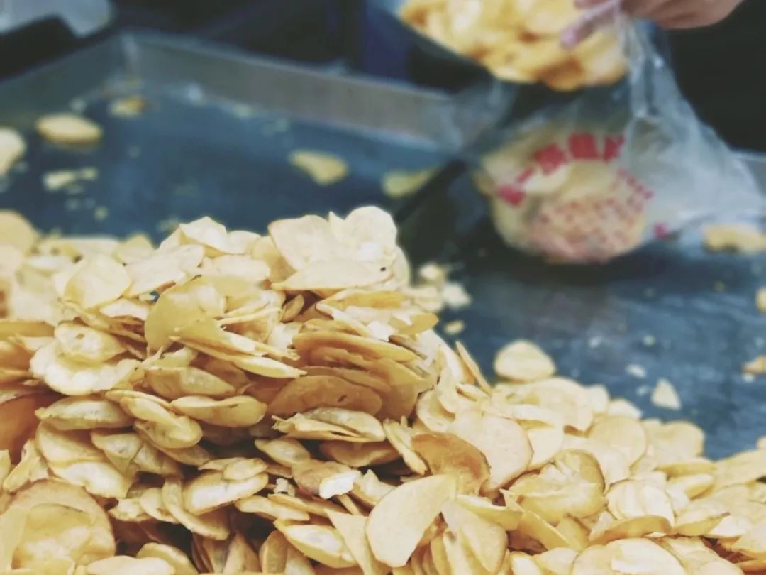 除了烧肉,酥脆油香的炸茨菇片更是日常最爱的小零嘴。茨菇切成薄而均匀的片片,切好后沥水晾干,放进新鲜的油锅,「刺啦」一声,热气裹挟着香味儿便源源不断冒出来,待到表面泛出金黄的色泽后,就能出锅了。香香脆脆的慈姑片丝毫不输薯片的口感,一片接一片,根本停不下来。