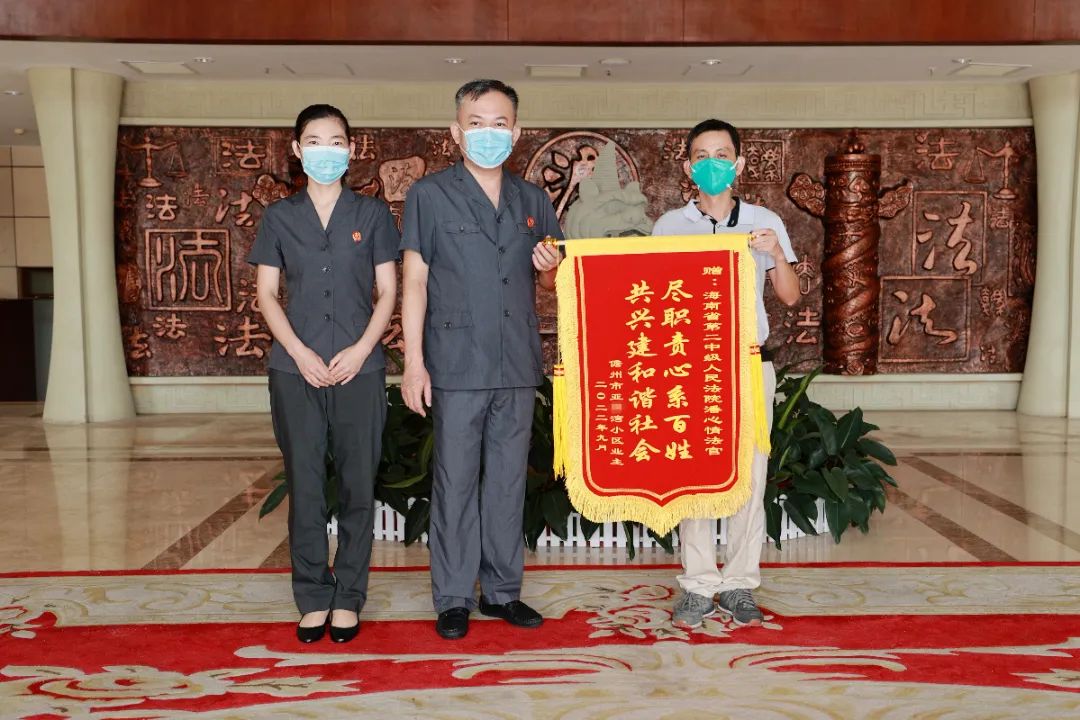 “感谢潘法官作出公正判决!为我们小区业主维护合法权益!”近日,一起业主撤销权纠纷案件的当事人郑先生来到海南省第二中级人民法院,向法官赠送一面印有“尽职责心系百姓,共兴建和谐社会”字样的锦旗,并对法官司法为民表示感谢。