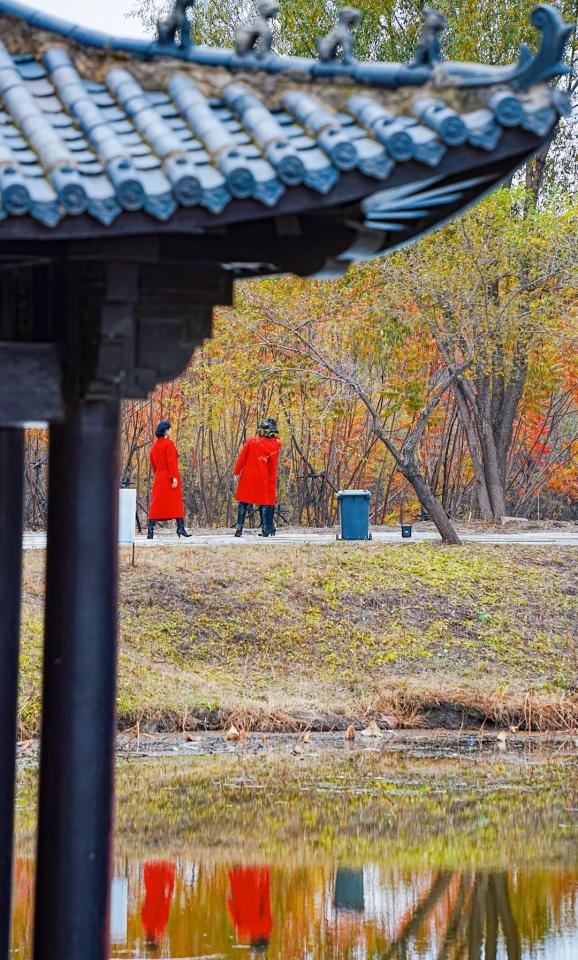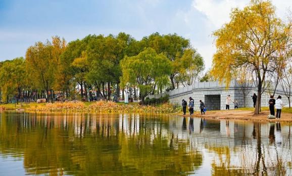 在秋阳的沐浴下,可以看到许多来此散步的市民游客,或是站在小桥上与友人惬意交谈,或是在湖边慢跑、健身,舒适又悠闲!