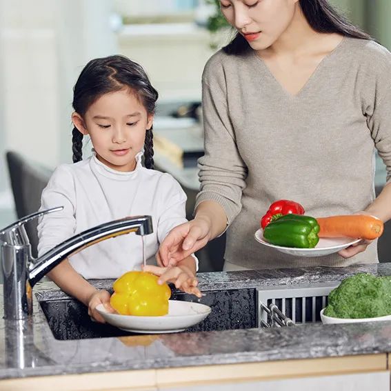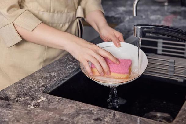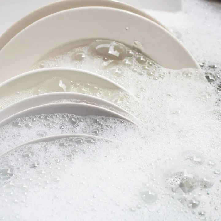 家庭清洗餐具应以冲洗为主,建议洗涤后的餐具最好冲洗三次,减少洗涤剂残留。