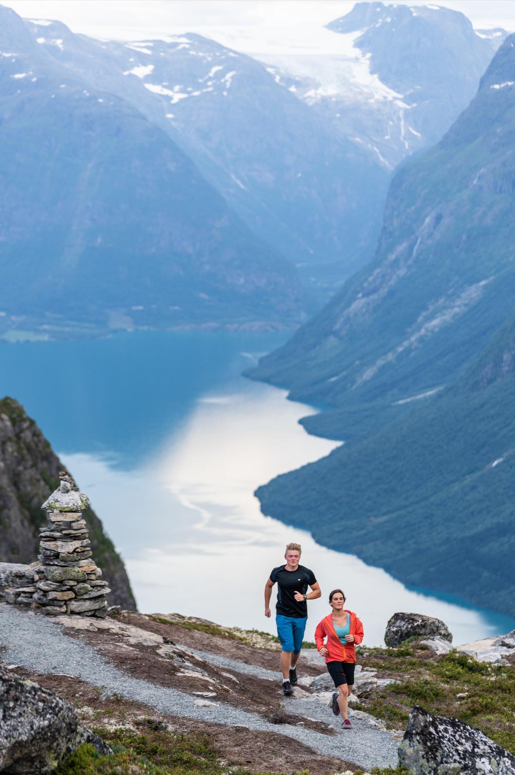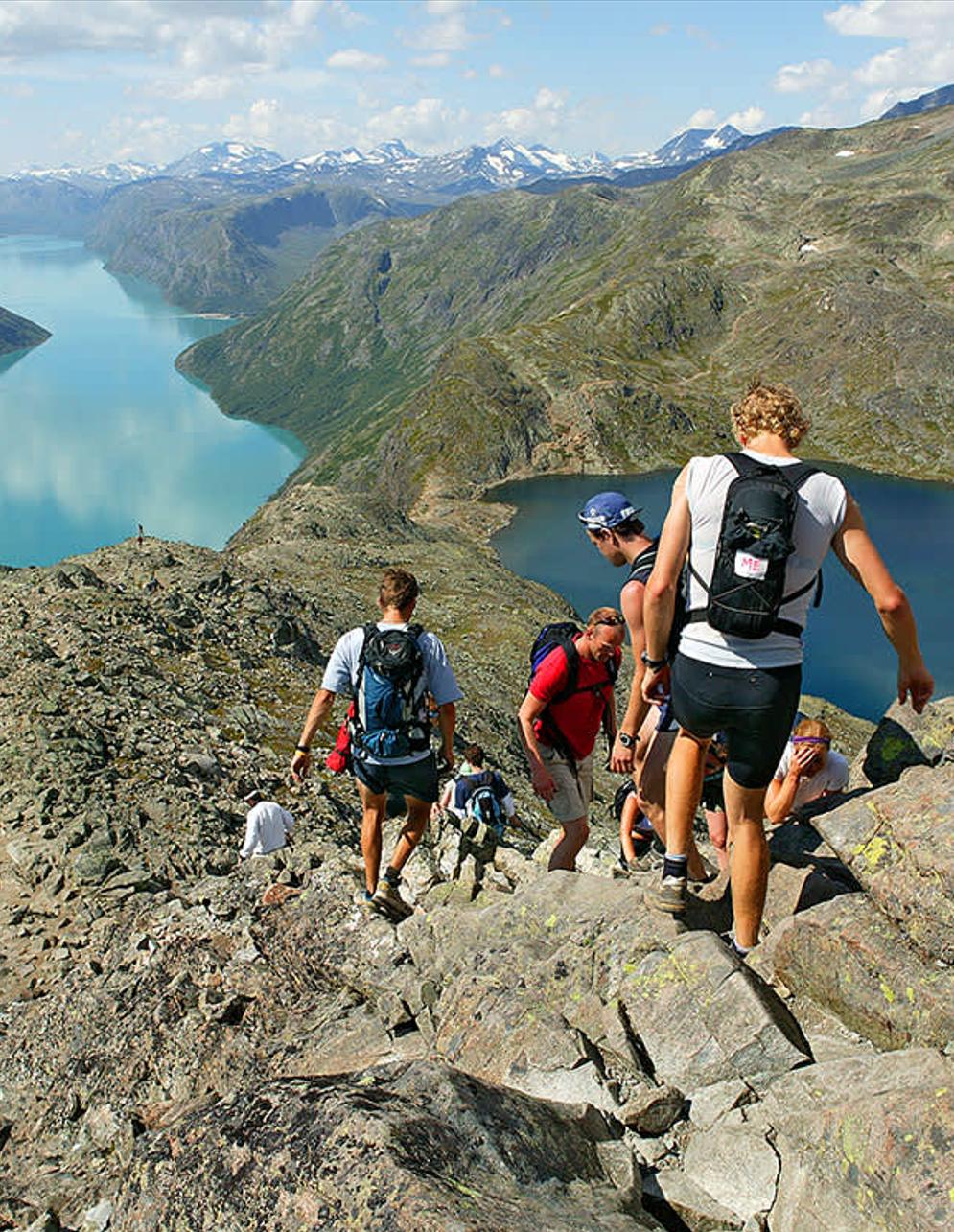 站在峻峭的山脊上,远眺是层林尽染的山地,手边则是如翡翠般的Gjende湖和Bessvatnet湖。