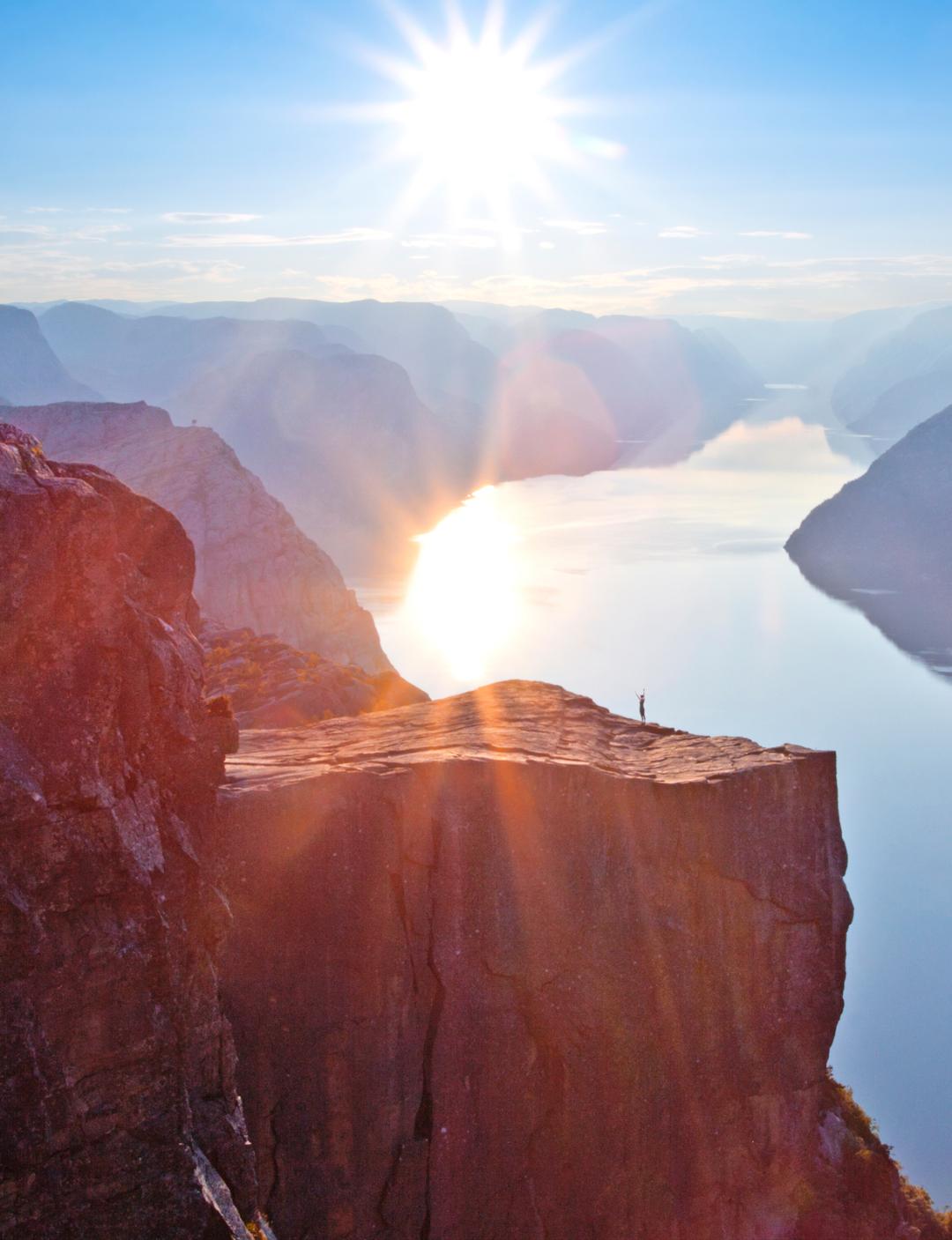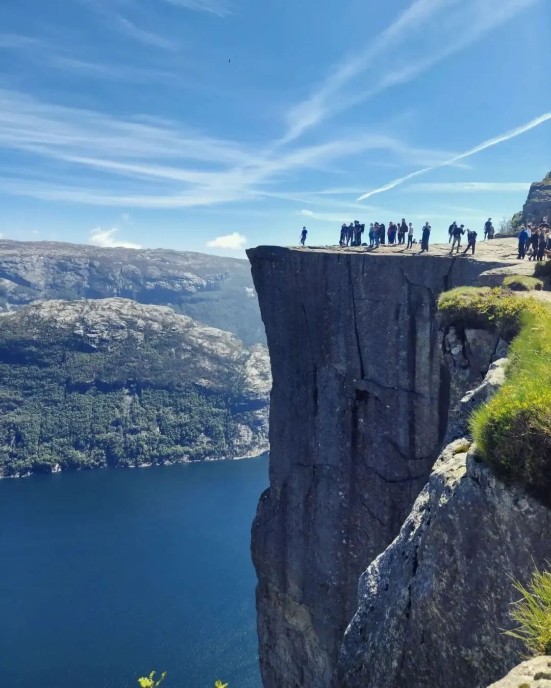 而徒步的终点便是著名的布道石(Preikestolen),这是一块天然形成的巨石,突兀地立于吕瑟深处的崇山峻岭中,垂直落差达604米,顶部则为大约625平方米的平台,也是观景的不二选择。
