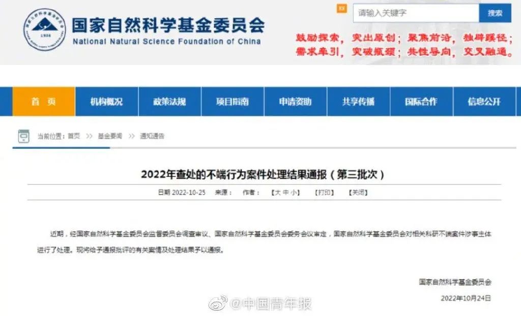 近日,国家自然科学基金委员会官网发布《2022年查处的不端行为案件处理结果通报(第三批次)》。据中国青年报报道,上述案件涉及来自北京大学、复旦大学、上海交通大学、大连医科大学等高校和科研机构的52名学者。其中,32名学者存在抄袭或抄袭剽窃项目申请书的问题,分别受到取消申请和参与申请国家自然基金项目资格3-5年、撤销已批准项目、追回经费、通报批评等处罚。