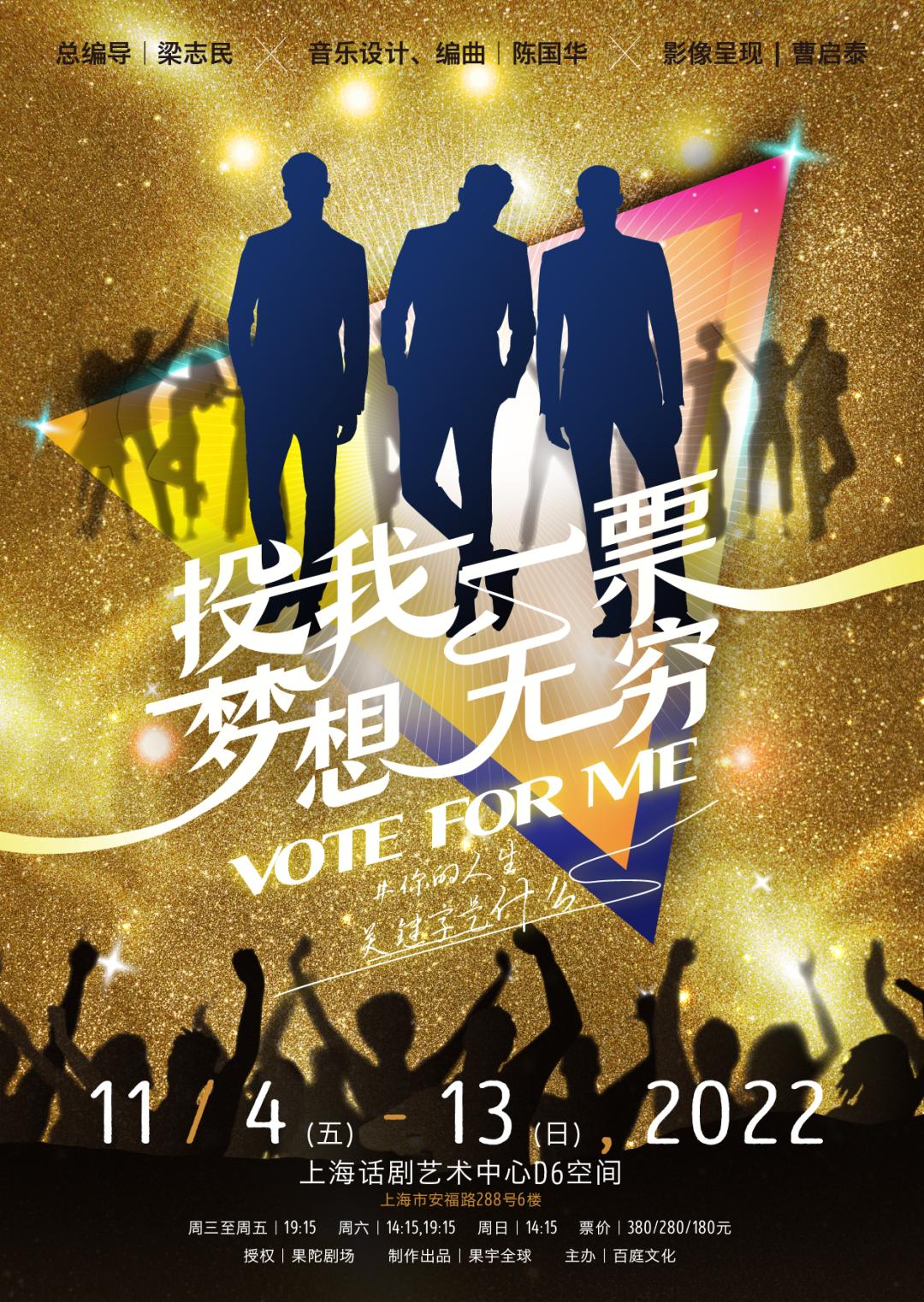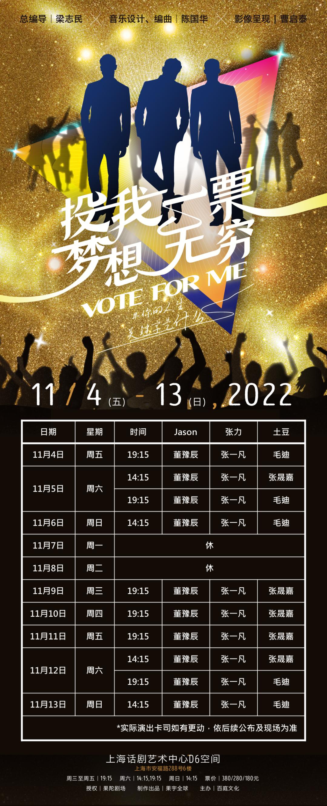 希望各位朋友在2022年11月4号到13号,都可以到上海话剧艺术中心来观看这部戏《投我一票 梦想无穷》。相信各位观众一定会感受到梦想、音乐与生活如何搭上线,也会让你非常的感动。等你来!