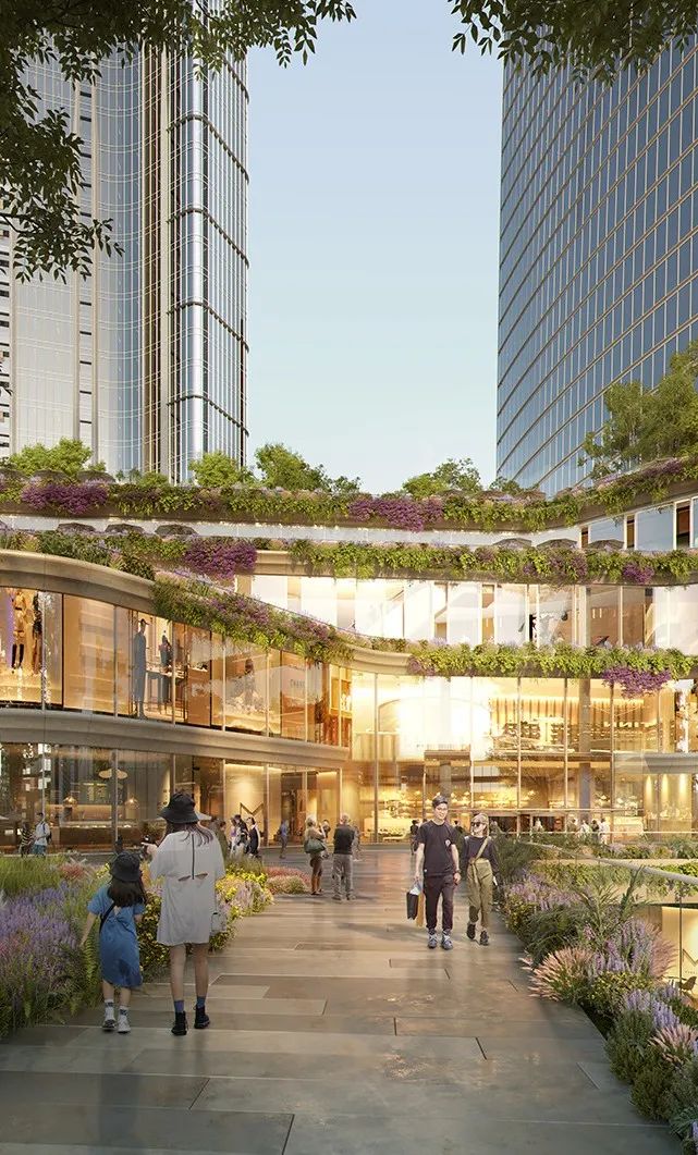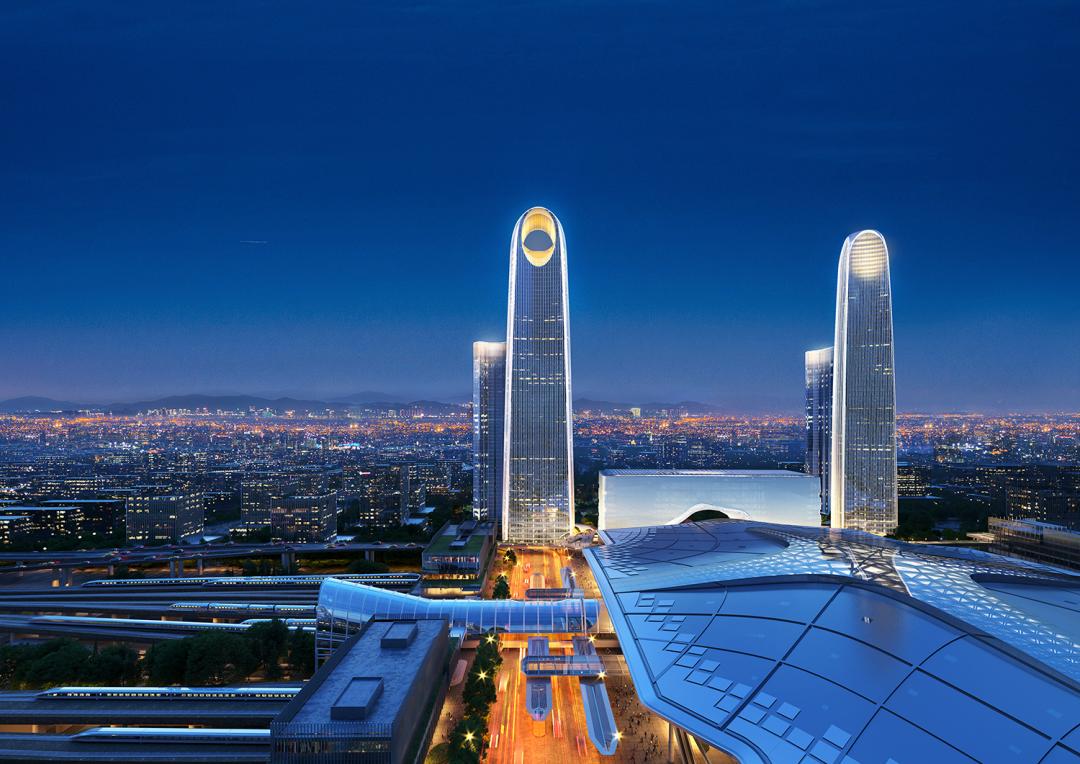 北综合体“金钥匙”位于杭州西站站房北侧,主塔楼高399.8米,外形酷似一把“金钥匙”,以“云端之窗”为设计理念,刷新了杭州的天际线。两座副塔楼以“凌云之芯”为设计理念,建筑形态极具现代科技感。