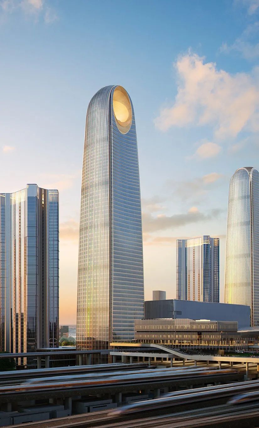 南综合体“金手指”高319.9米,一共61层,高度仅次于北综合体主塔楼。与“云端之窗”的北区金钥匙造型不同,“金手指”整体形态柔中带刚,顶部“镂空”,以“云眼”为设计理念。