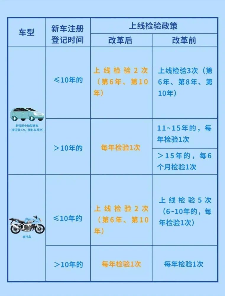 为优化私家车检验周期,自2022年10月1日起,10年内非营运小微型载客汽车,检验次数由3次调整为2次,每两年向公安交管部门申领检验标志;超过15年的,由每半年检验1次调整为每年检验1次。