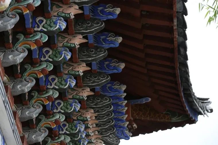 墙心粉白,檐口彩画宽窄不同,饰有色彩相间的装饰带。
