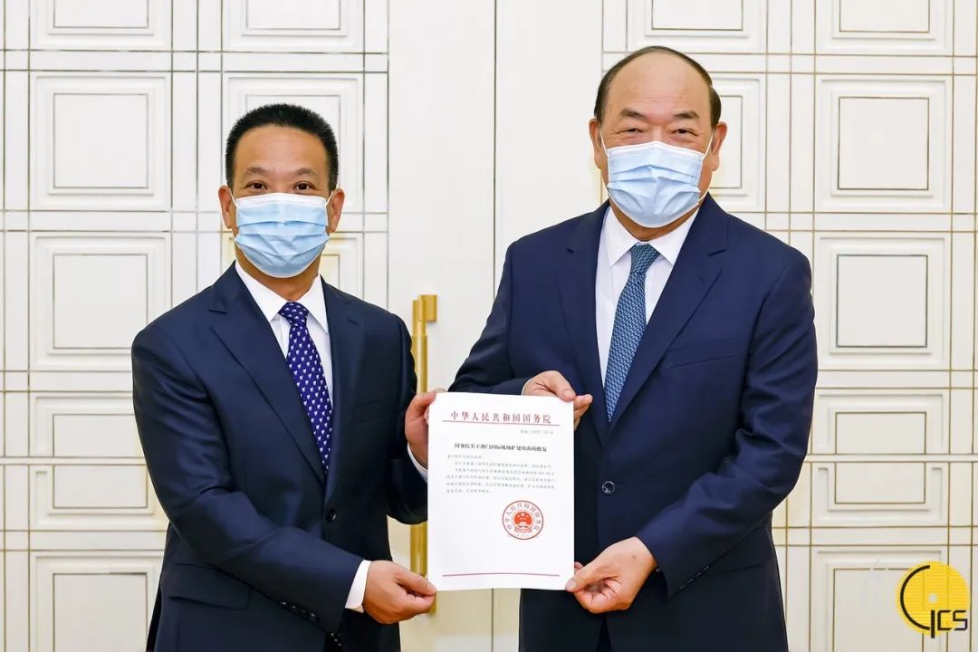 图:贺一诚(右)接收国务院关于澳门国际机场扩建填海的批复文件,由国务院港澳办副主任黄柳权转交。 来源:澳门特区新闻局
