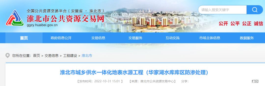 淮北市城乡供水一体化地表水源工程(华家湖水库库区防渗处理),其中有:1.库区防渗处理工程,包括土工膜水平防渗处理、库底碾压防渗处理、断层及裂隙处理工程;2.库岸整治工程包括库岸岩石出露面防渗处理、库岸整治;3.左岸坝基防渗处理;4.水库大坝白蚁防治;5.水源地保护工程等。工程预算约12978.3万元。
