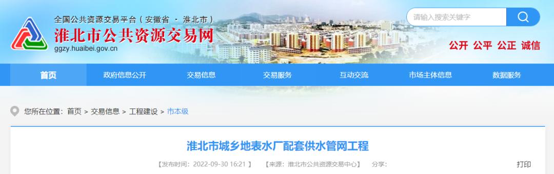 项目概况:本项目为淮北市城乡地表水厂配套供水管网工程,项目地点位于淮北市;包含新建配水干管,共 66.0Km;新建及改造城区供水支管共计43.5Km;新建乡镇农村配水管网44.4km。改造现有加压泵站三座,改造现有水源井泵房作为应急水源,新建配套配水管网监控系统等智慧水务系统。项目总投资约77131.28万元 。