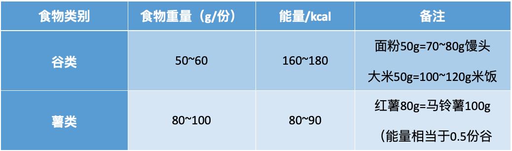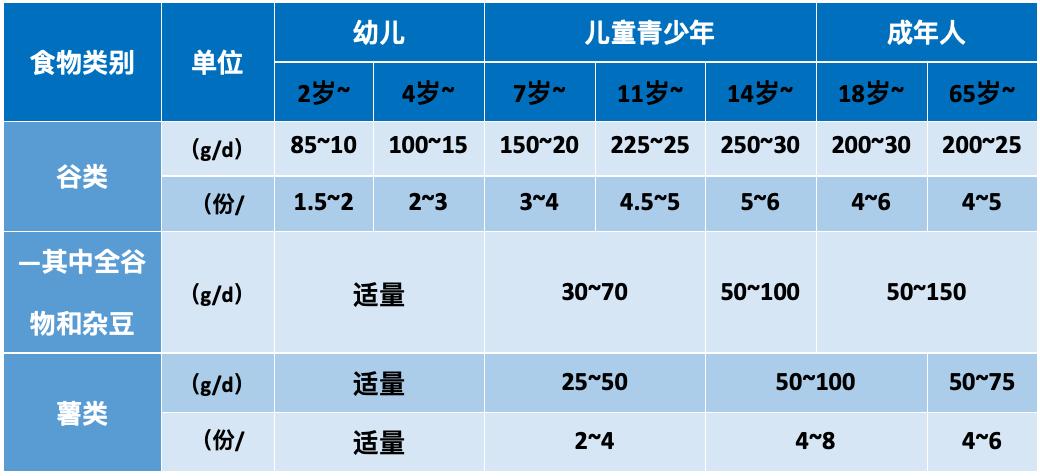 《中国居民膳食指南(2022)》建议平均每天摄入谷类食物200~300g,其中包含全谷物和杂豆类50~150g;薯类50~150g[1]。表1是不同人群的主食建议摄入量,供大家参考。