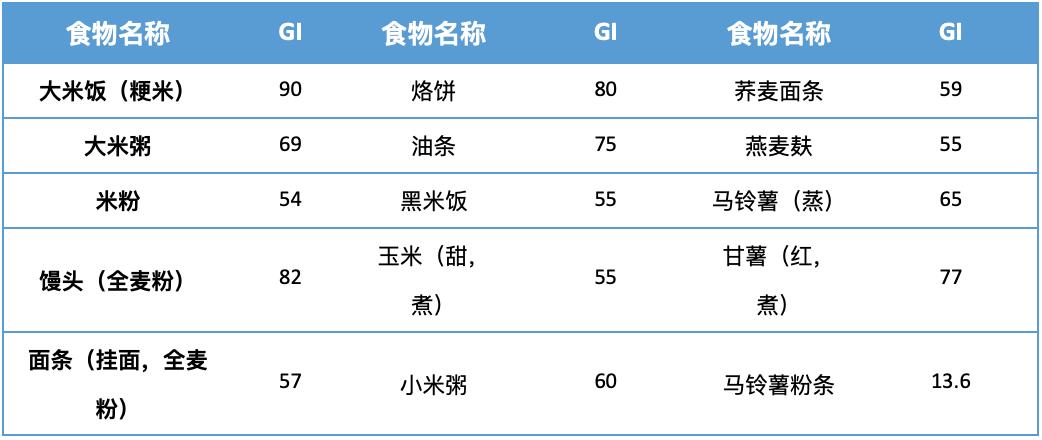另外,食物搭配对GI值也有一定的影响,主食与富含蛋白质、脂肪及膳食纤维的食物做成的混合饭菜,可降低血糖生成指数,如杂粮饭、荠菜鲜肉小馄饨、胡萝卜鸡丝面等。下表为常见主食的GI值,供大家参考。