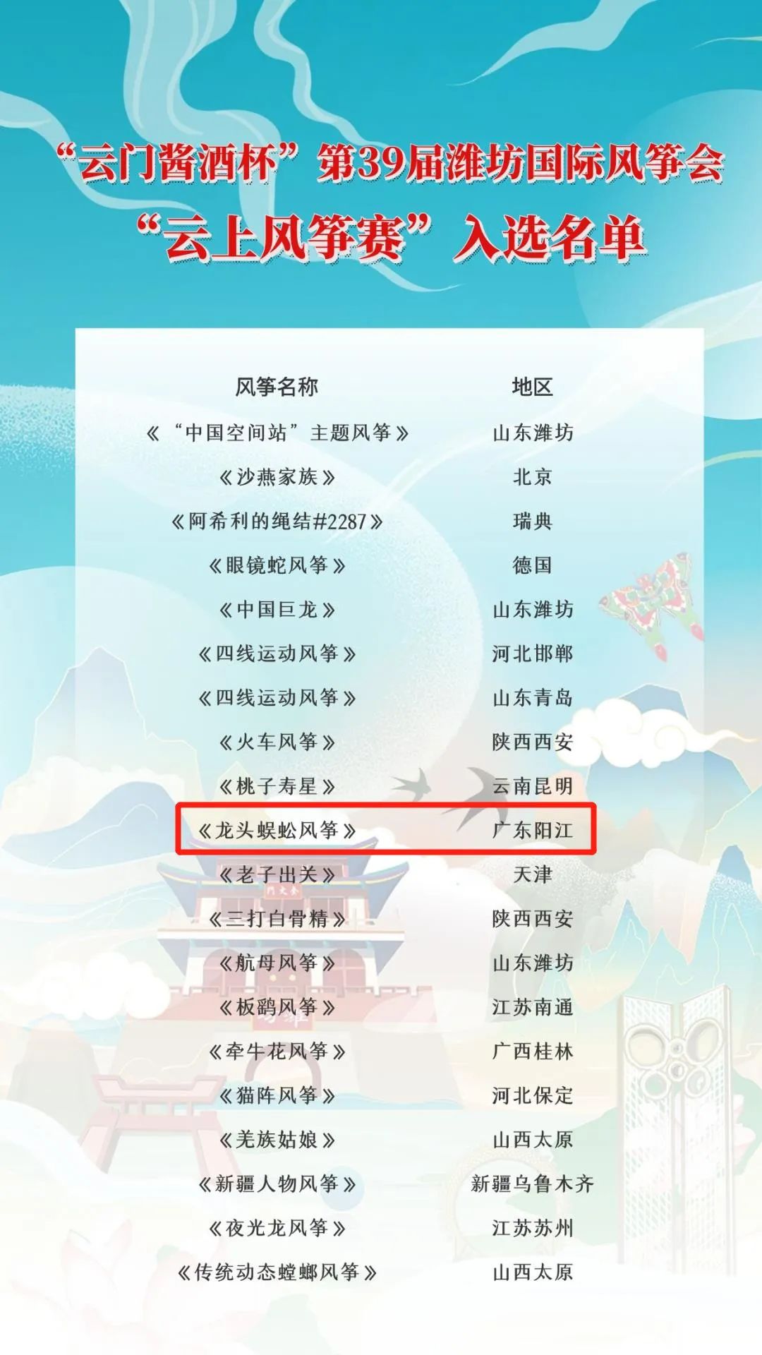 数据显示,本次“云上风筝赛”累计获得投票1104983票,共评出金奖1名,银奖3名,铜奖6名,优秀奖10名。其中,阳江的《龙头蜈蚣风筝》以214737票获评金奖。在潍坊风筝选拔赛中备受关注的《“中国空间站”主题风筝》《航母风筝》,摘得银奖。