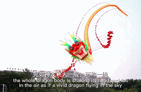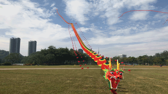 风筝设计者阮权是广东省非物质文化遗产项目阳江风筝省级传承人,他“揭秘”了这只风筝与众不同的特点:“龙头蜈蚣风筝也叫‘龙头百足’,是阳江风筝最具代表性的作品之一。设计制作这只风筝用了大约半个月的时间,与很多龙头蜈蚣风筝不同的是,龙身的腰片我采用的不是‘五五分’的结构,而是‘上六下四’的‘四六分’结构,由三根线操控完成各种形态的变化。”