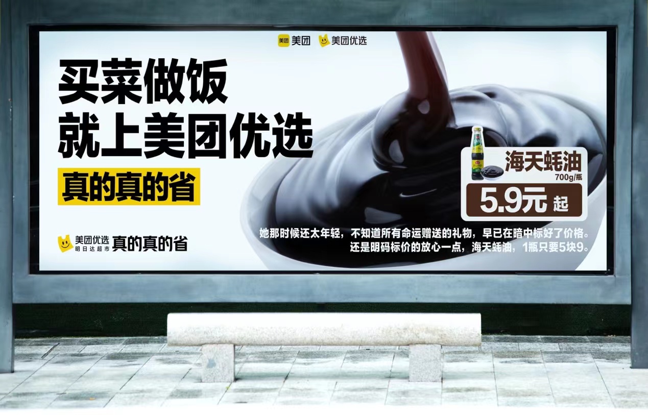又到了每年各大品牌促销活动竞相登场的时候,在众多同质化的营销活动里,美团优选的一组创意广告,让人耳目一新。近日,美团优选在广东惠州的公交车候车亭灯箱上,投放了一组以“省钱文学”为创意点的平面广告,将文学金句与蔬菜商品相结合,以超戏剧化转折手法改编的方式,激发了消费者的阅读欲望,完成了省钱消费观的传播。
