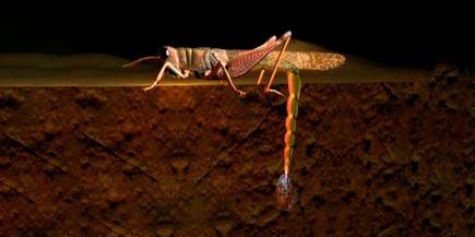 蝗虫产卵时选择适宜的土壤和场所,用腹部末端坚硬的产卵器接触地面,腹部下弯,将卵粒依次产下,同时排出些泡沫状的胶液,把所有的卵粒包严,最后形成不怕水浸霜冻的保险胶袋。