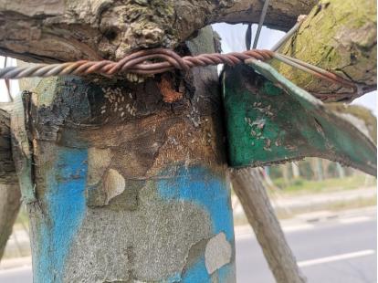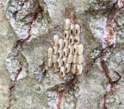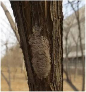 斑衣蜡蝉在上海主要产卵于臭椿树干上,卵粒平行排列成卵块,其上覆一层土灰色分泌物,既可以保温,又可以伪装,不易被发现。