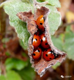 瓢虫抱团取暖,成群地躲在树叶里、墙缝中