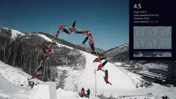 一般来说,运动员穿戴滑雪板从跳台跃起后,要在 15 米高空中做出各种空翻和转体动作。尽管整套动作滞空时间仅 2-3 秒,但「观君」能做到实时分析起跳动作、腾空高度、空中动作难度与完成度、落地稳定性等方面,并在动作完成后立即指出失误。