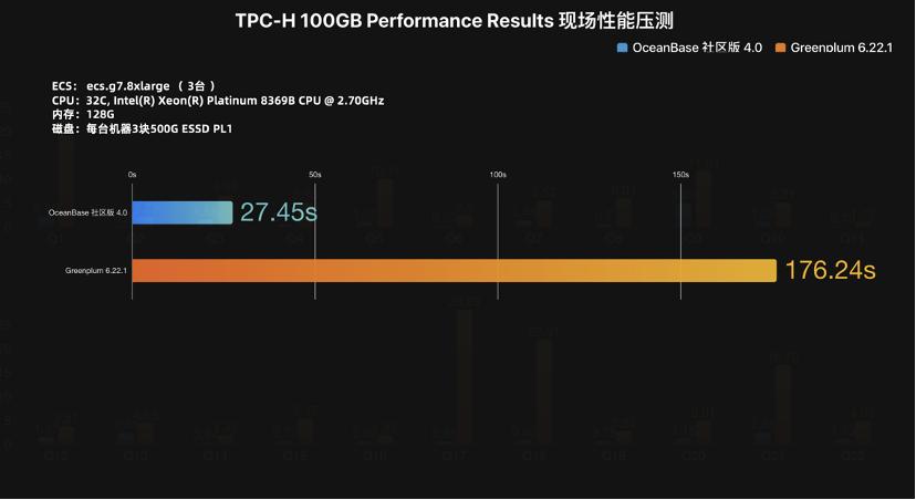 OceanBase CTO 杨传辉现场演练社区版 4.0 的 TPC-H 性能。同等硬件环境下(3 台 32C,128G),OceanBase 社区版 4.0 Beta(蓝色)与 Greenplum 6.22.1(橙色)在 22 项复杂查询及并行数据修改任务中的压测时长,柱状图的长度对应任务用时的长度。从测试结果可见,OceanBase 整体性能优于 Greenplum,在并行执行尤其是分区内并行执行上具有明显优势。