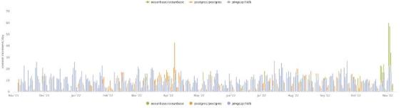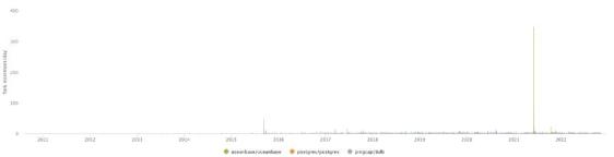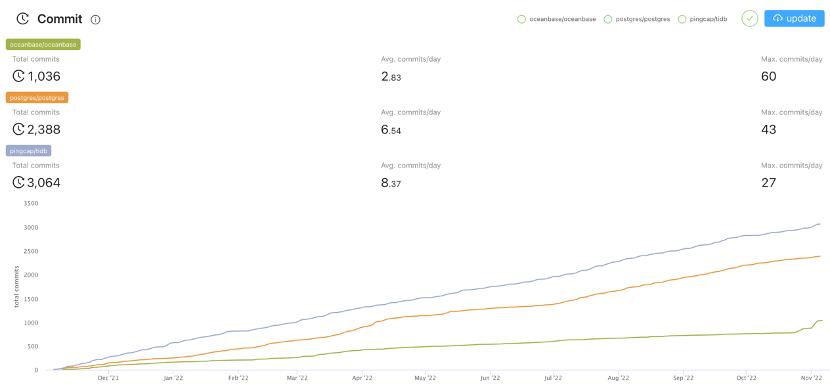 根据 GitHub 统计数据,本次新版本的上线让 OceanBase 在项目活跃度上有了一个明显的提升。下图为过去一年 OceanBase (绿)、PostgreSQL (橙)、TiDB (蓝) 的 GitHub Commits 情况。