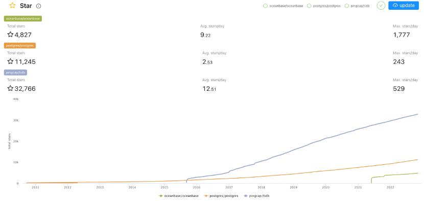 自 2021 年 6 月开源后,OceanBase 的 GitHub 单日最高 Star、Fork 和 Commit 数值,均明显高出 PostgreSQL 等流行数据库,充分证明了开发者对 OceanBase 给予的热情和期望。