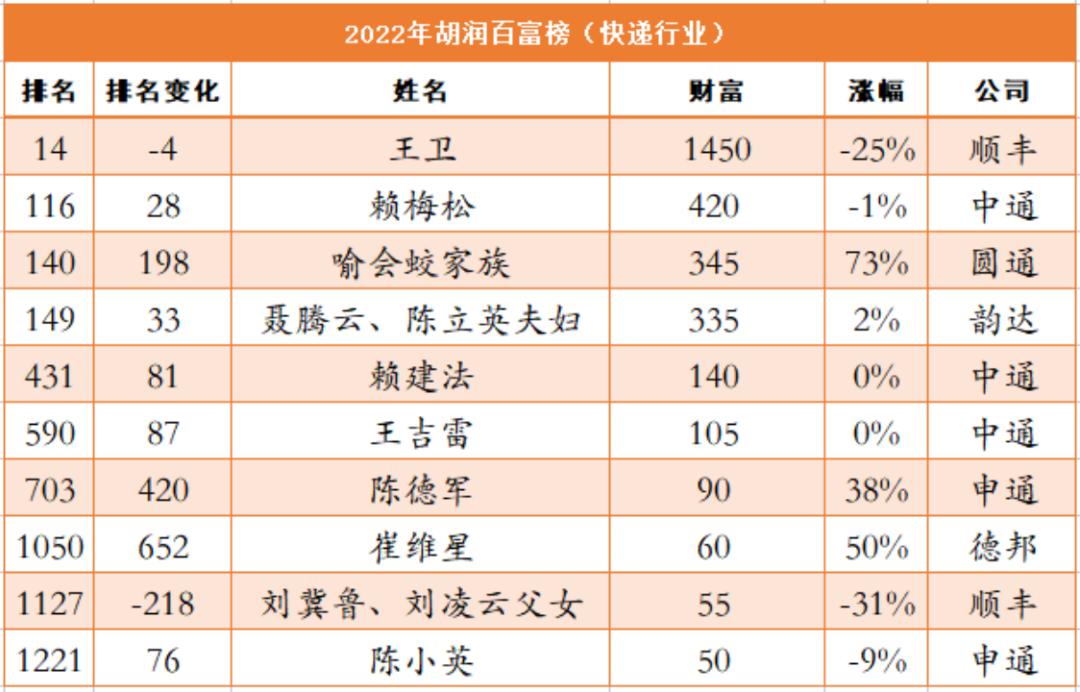 榜单显示,顺丰董事长王卫以1450亿元的财富,位列第14名,相比去年财富下降了25%,排名也下跌了4个名次。此外,顺丰上市时所借壳的鼎泰新材的原股东刘冀鲁、刘凌云父女也入围了榜单。