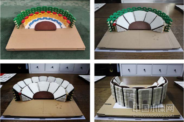 虽然从小就喜欢用乐高搭房子,但凭空开始创作建筑是第一次。于是,陈梦竹想到用乐高先搭个模型,确定剧场各个元素的大小和形状,圆看台每一块的角度都是拿量角器一点一点测试得来的。绘制好各个元素的尺寸和形状,再用3D建模打印饼干模具,烤好所需数量的各个模块饼干后进行糖霜绘制,所有饼干都涂好糖霜后才开始搭建,连接处也是用糖霜进行黏合。