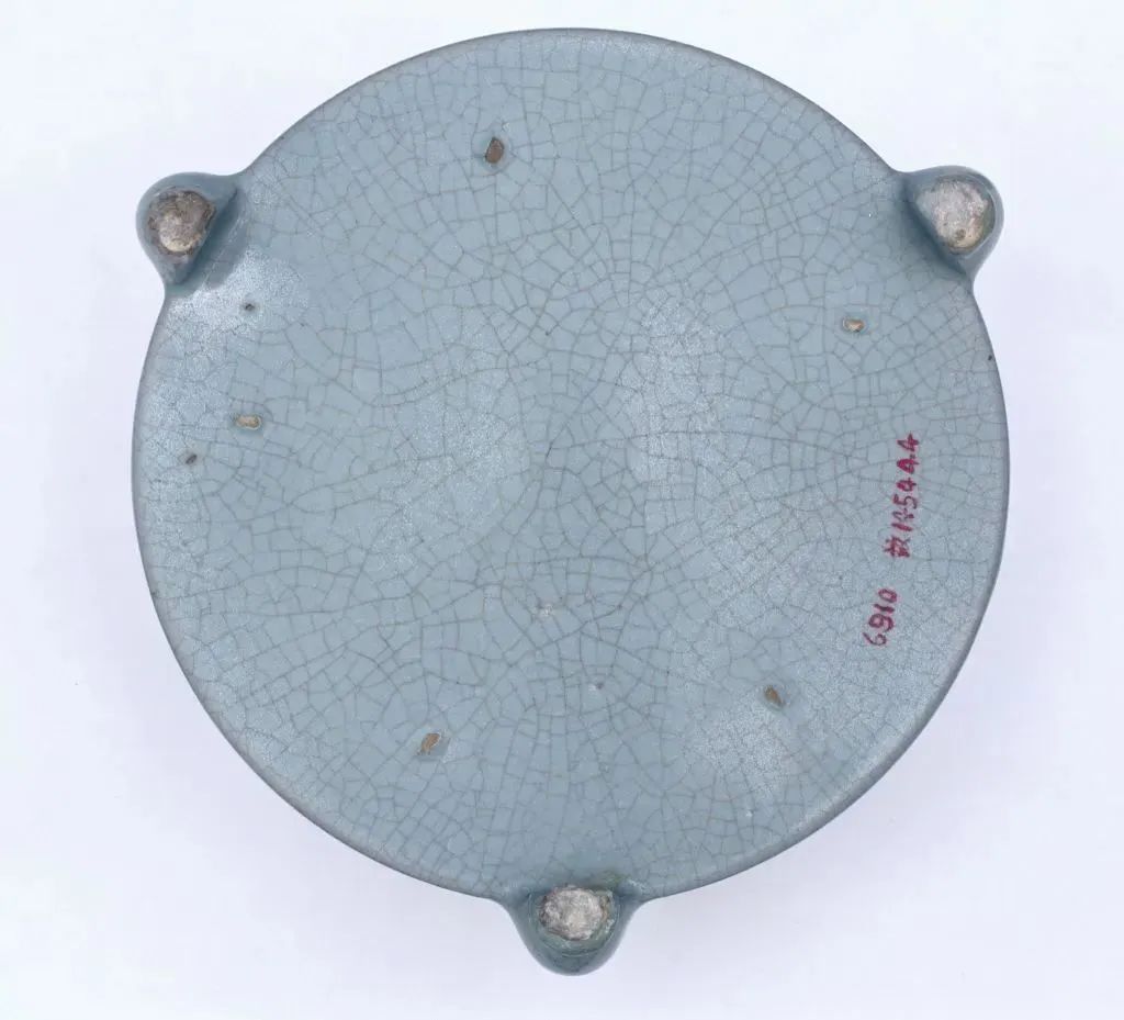 汝窑淡天青釉弦纹三足樽式炉底部