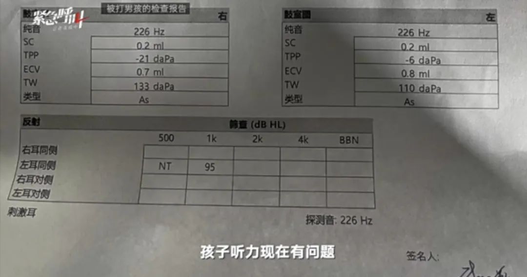 据了解,被掌掴的男童和男童爷爷均有受伤。唐女士称,孩子被打后,自称头比较晕。11月9日早上,她带孩子去医院检查,结果显示“面部挫伤、(左)外耳挫伤”,孩子听力也受了一些影响,医生建议我们做进一步检查。门诊病历上的辅助检查一栏也显示“声导抗检查示双侧声反射无法完全引出”。
