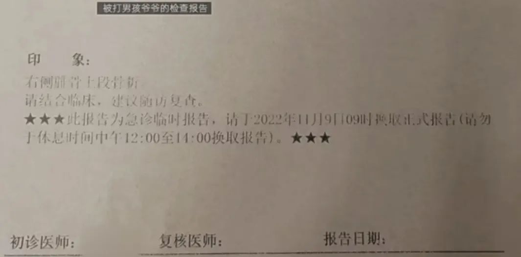 另一份孩子爷爷在该院的检查报告单显示,其右侧腓骨上段见多条骨折线,断端对位尚可。报告单印象为“右侧腓骨上段骨折”。