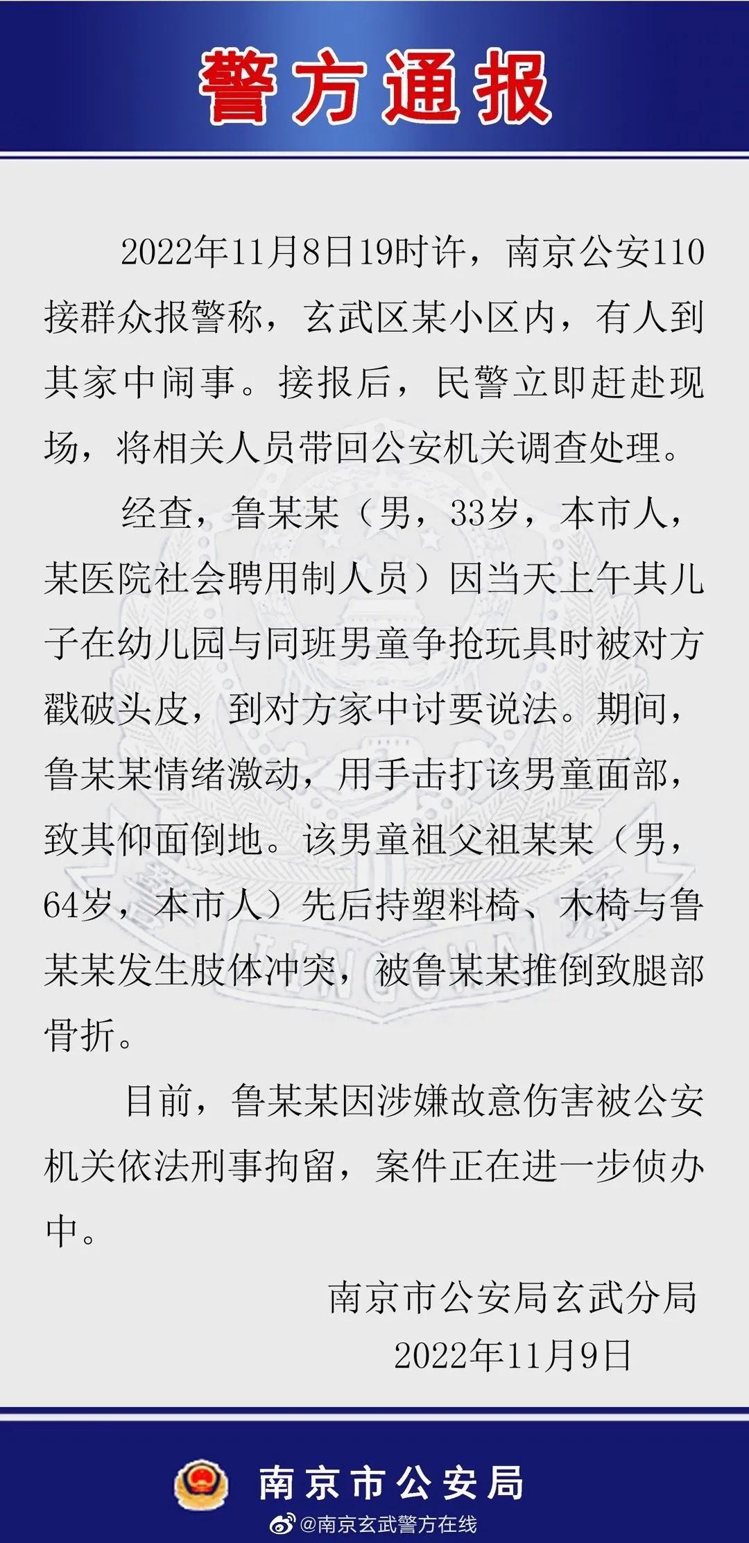 经查,鲁某某(男,33岁,本市人,某医院社会聘用制人员)因当天上午其儿子在幼儿园与同班男童争抢玩具时被对方戳破头皮,到对方家中讨要说法。期间,鲁某某情绪激动,用手击打该男童面部,致其仰面倒地。该男童祖父祖某某(男,64岁,本市人)先后持塑料椅、木椅与鲁某某发生肢体冲突,被鲁某某推倒致腿部骨折。