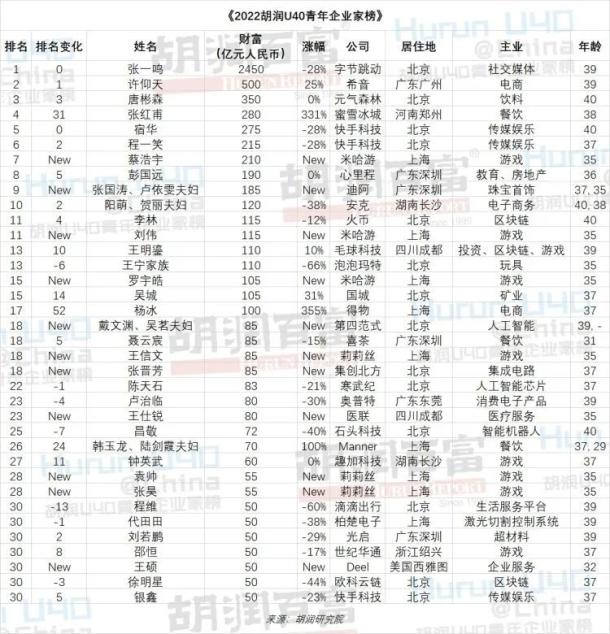 胡润研究院今日发布《2022胡润U40青年企业家榜》(Hurun Under 40s China Rich List 2022),列出了今年胡润百富榜上40岁以下(含40岁)的白手起家的企业家。这是胡润研究院连续第七次发布此榜单。