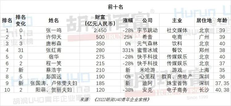 抖音创始人39岁的张一鸣蝉联40岁以下白手起家首富,财富2,450亿元,比去年减少950亿元。希音39岁的许仰天以500亿元财富位列第二,比去年上升一位,财富比去年增长25%。元气森林40岁的唐彬森以350亿元财富位列第三,比去年上升3位。蜜雪冰城38岁的张红甫以280亿元财富首次进入前十,位列第四,比去年大幅上升31位,财富比去年上涨三倍多。